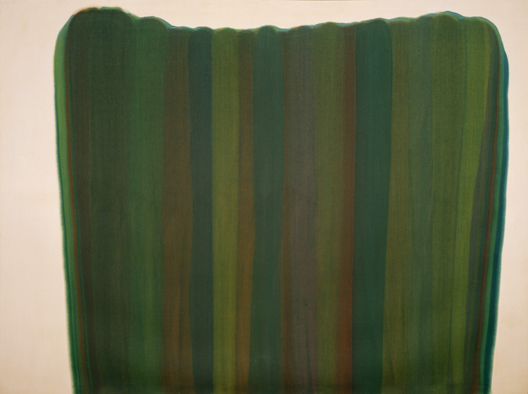 Louis used the title Capricorn for two paintings (see also cat. no. 197). The arrow inscribed on the back of the canvas indicates that at one time Louis intended to have the painting hung “upside down” (relative to the position in which it is reproduced here). For information regarding the dating of this painting, see Remarks for Masque, cat. no. 189.